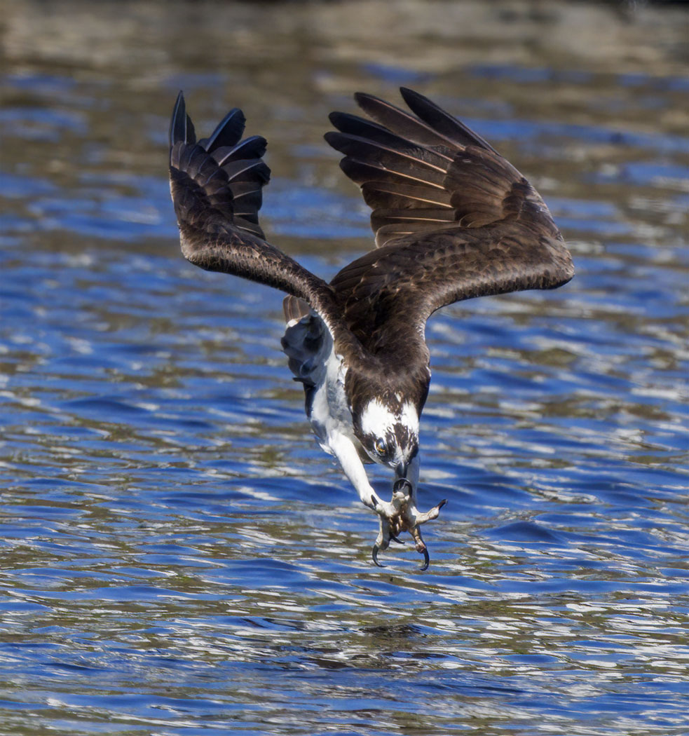 Talons on Target - An osprey dives for a fish with talons in wide open position. Notice that its nictitating membrane is in the process of closing to protect its eyes from the water entry.