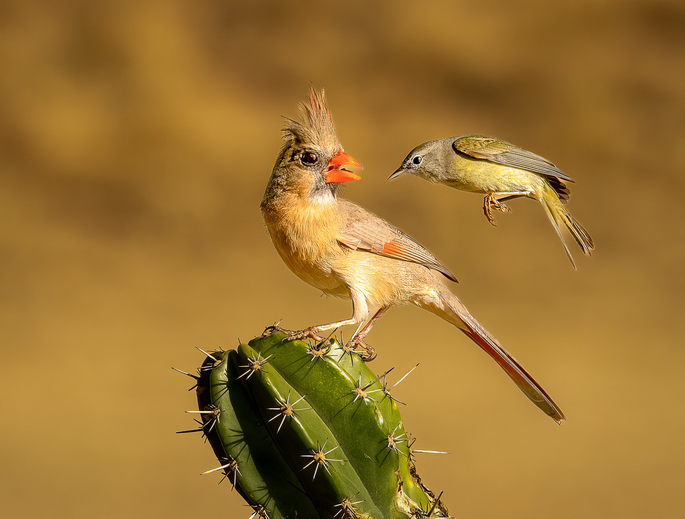 A little Orange Crowned Warbler fearlessly darted at a female Cardinal and won the perch.