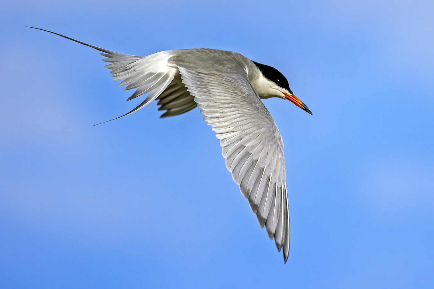 Forster's terns are shallow plunge-divers that often hover before attacking. When hunting, the head is pointed downward, whereas when travelling, it is pointed forward.