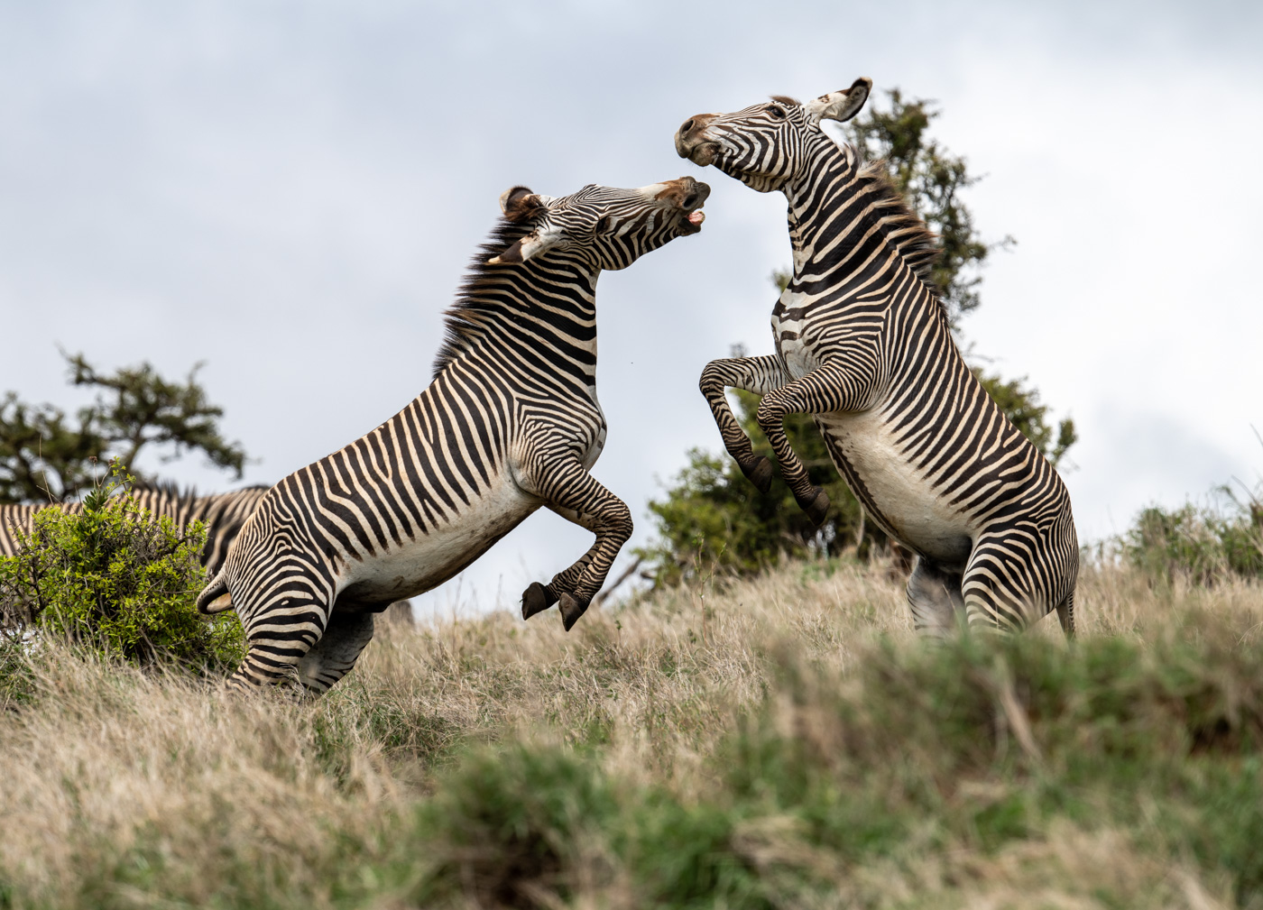 Grevy's zebra stallions fighting for territory. "Fighting for territory" has a second meaning in this image. The Grevy's zebra is listed on the IUCN Red List as endangered. This is due to habit loss and competition from other wildlife and domestic livestock for water and pasture. It is up to us to fight for the territory for these amazing animals.