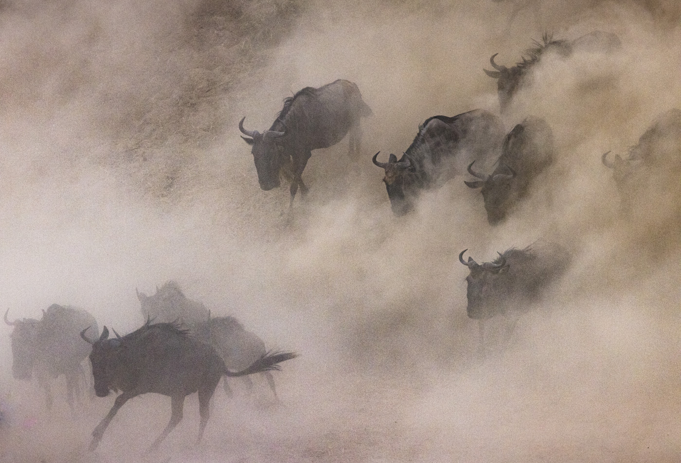 Frenzied wildebeest bolt, unseeing, through the dust towards the Mara River, driven by desperation for green grass.