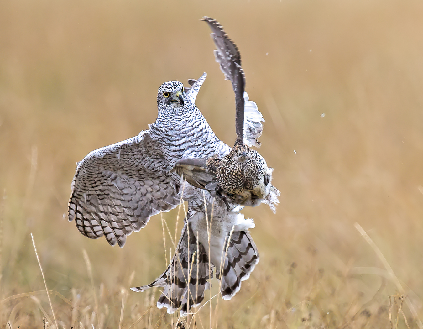 A trained goshawk capturing a wild grouse.