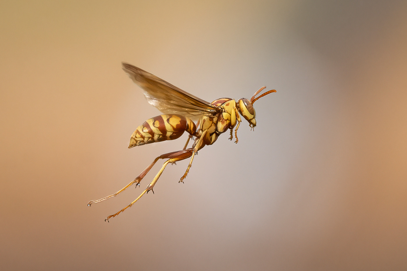Several insects were drinking from a mud hole in Southern Texas, this Cicada killer drank long enough for me to lock on as it lifted off the pond.
