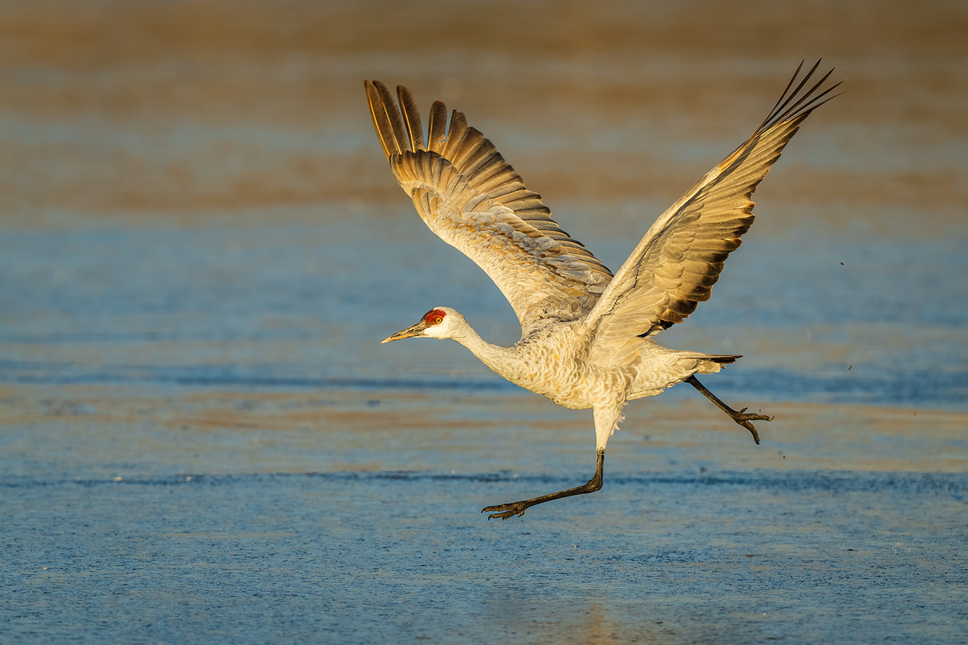 Taking off at sunrise on a frozen pond