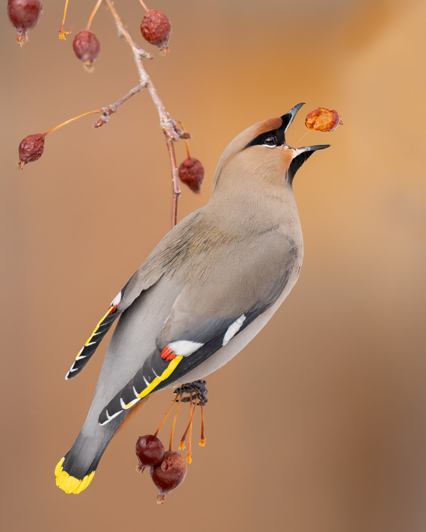 A Bohemian Waxwing after crabapples, one from a flock of over 350 during the irruption in January.