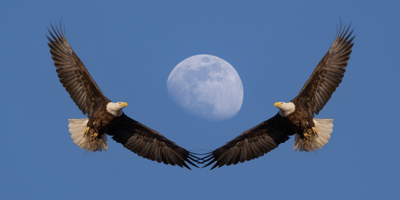 This is a mirror image of a bald eagle with nesting material. The eagles were brought together to appear to be holding hands (wing tips). The moon image was taken on the same day in the same location as the eagle photo and was added to the mirrored image of the eagle.