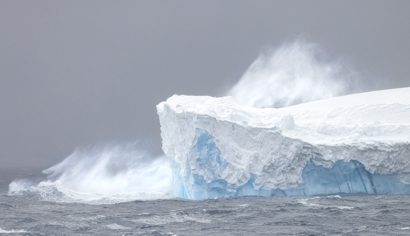 Icebergs get pounded by waves during gale force winds in Antarctica. Extreme weather helps to shape them as much as melting.