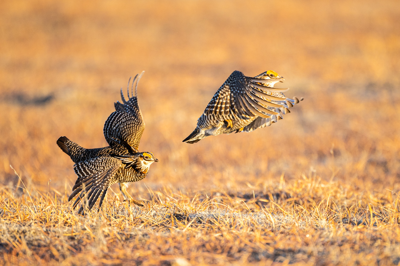 Male prairie chickens fight over territory on the lek.
