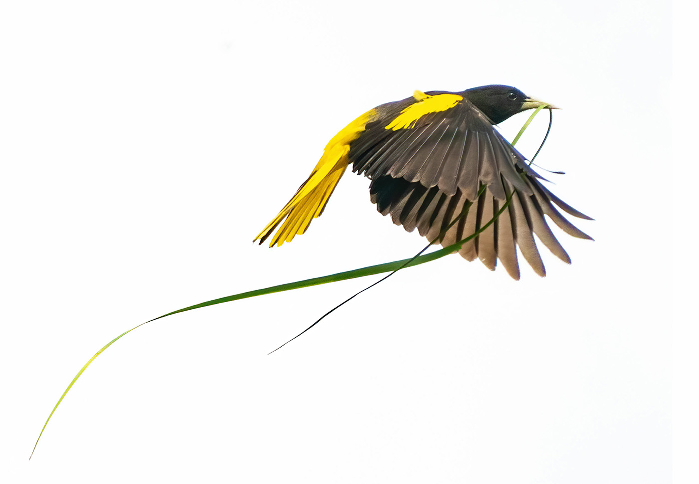 Yellow-winged Cacique carrying nesting materials to the nest.