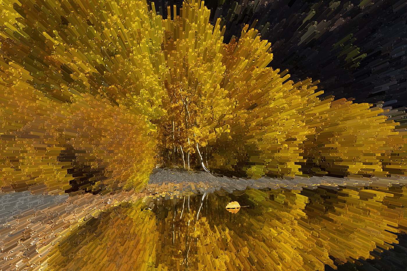 Applied Photoshop - Filter - Stylize - Extrude filter; erased effect on center trees and reflection; added leaf reflection from another image