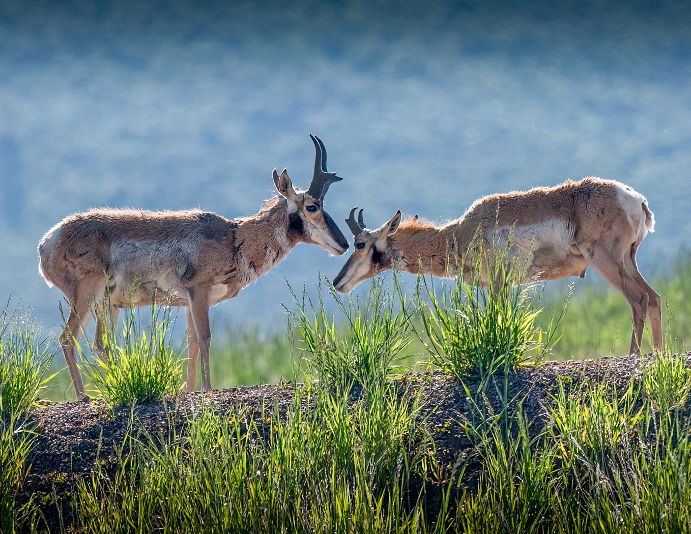 Pronghorn Antelope meet on a ridge near Willow Creek reservoir at sunrise