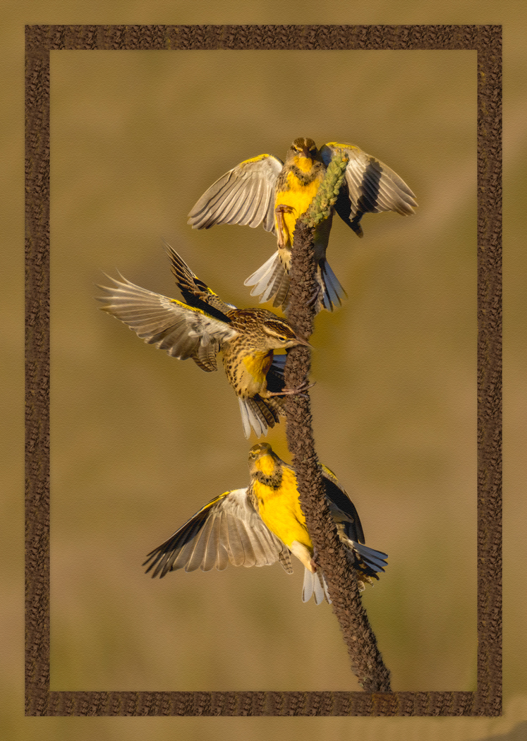 Selected 3 frames of a meadowlark trying to land on a windblown mullein, created an arched extension of the mullein, repositioned the three images, added a border and texture layer.