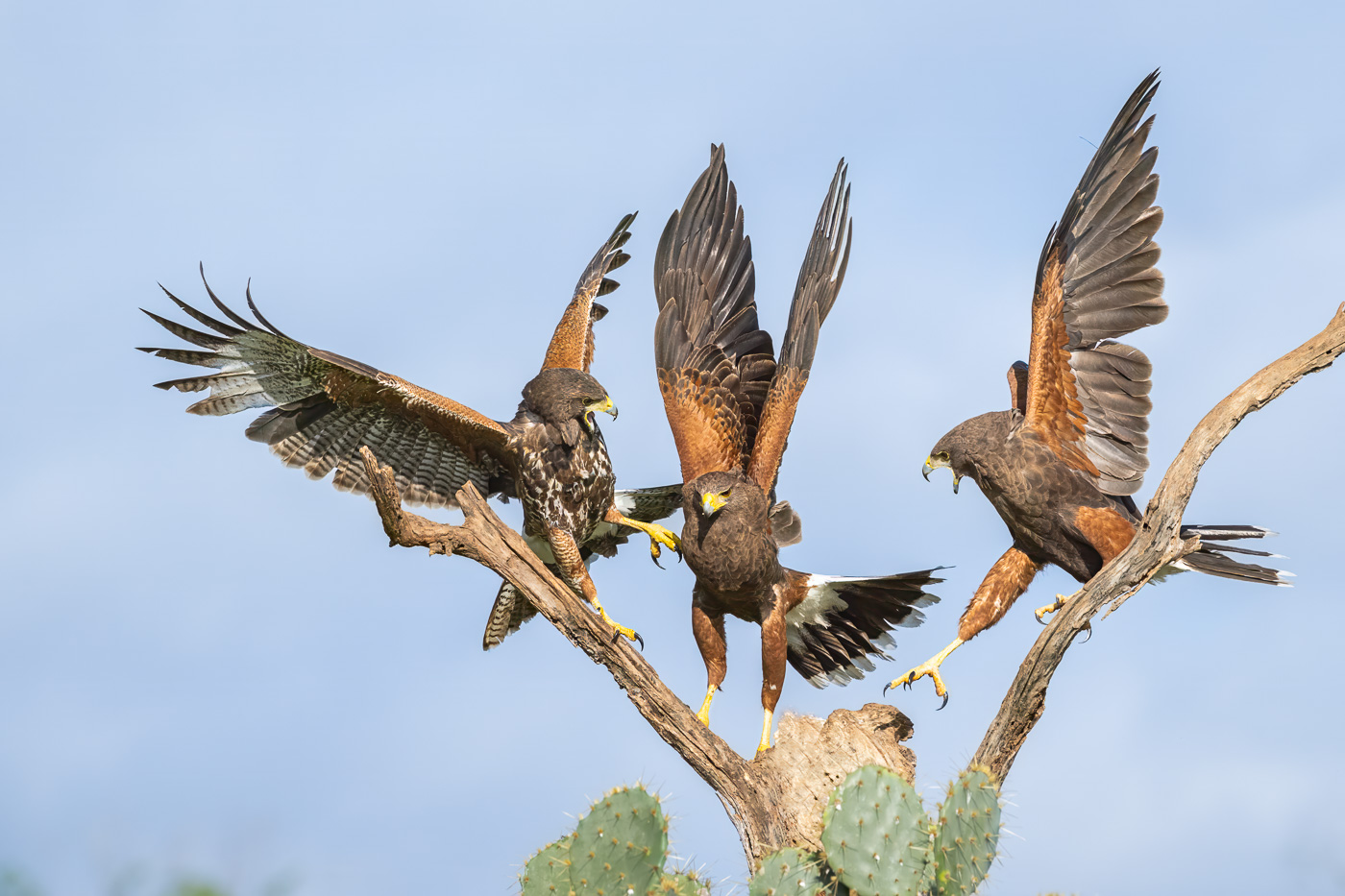 The center Hawk is a male, the right Hawk is a female, and the left Hawk is an immature female.