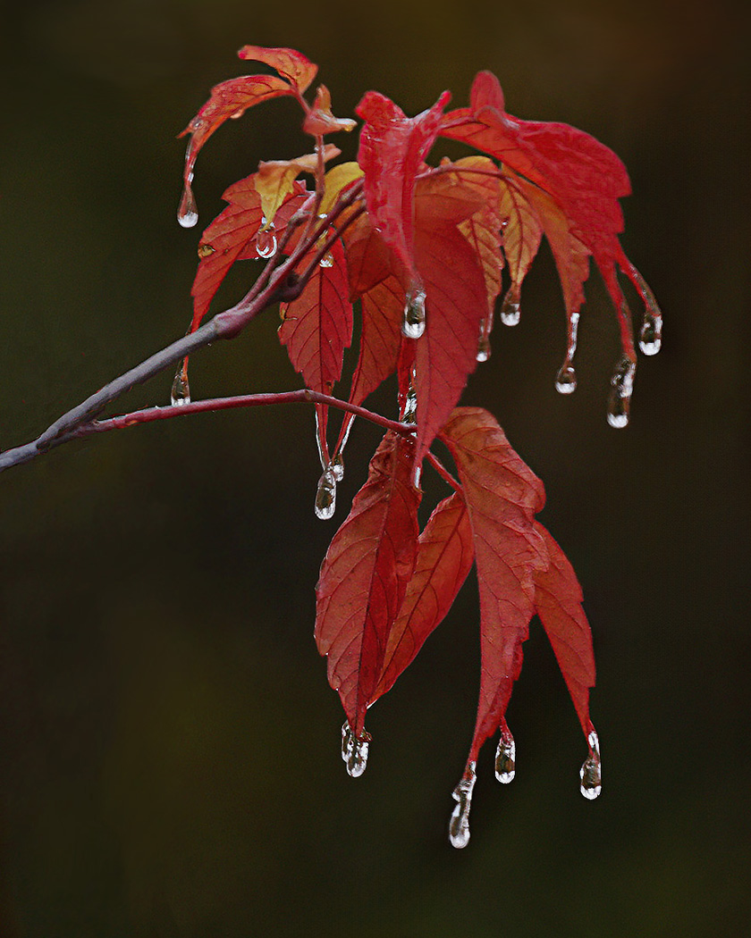 Water droplets hanging from turning color Virginia Creeper leaves.