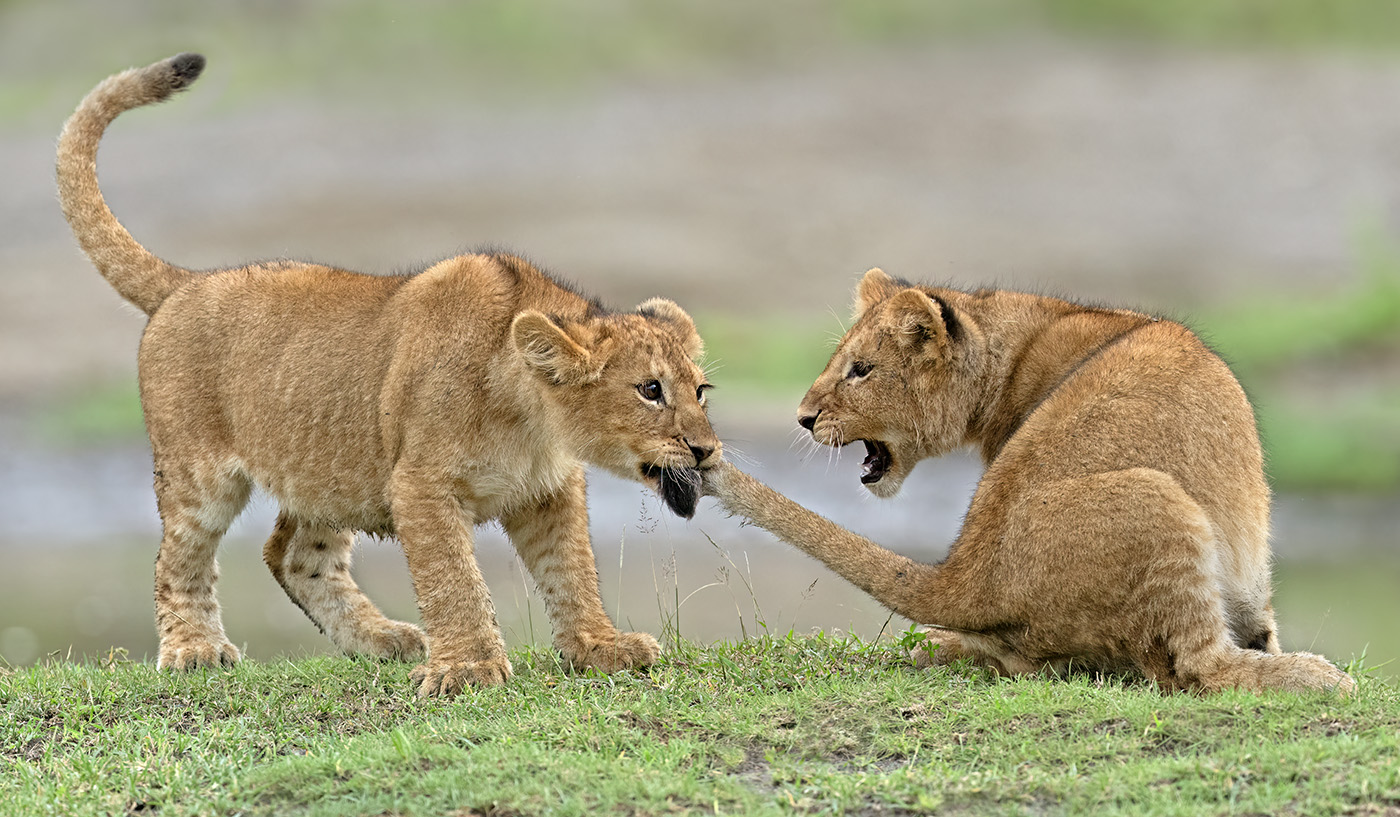 Always on the go, lion cubs are full of mischief and attack anything they can get a hold of. That includes a sibling's tail.