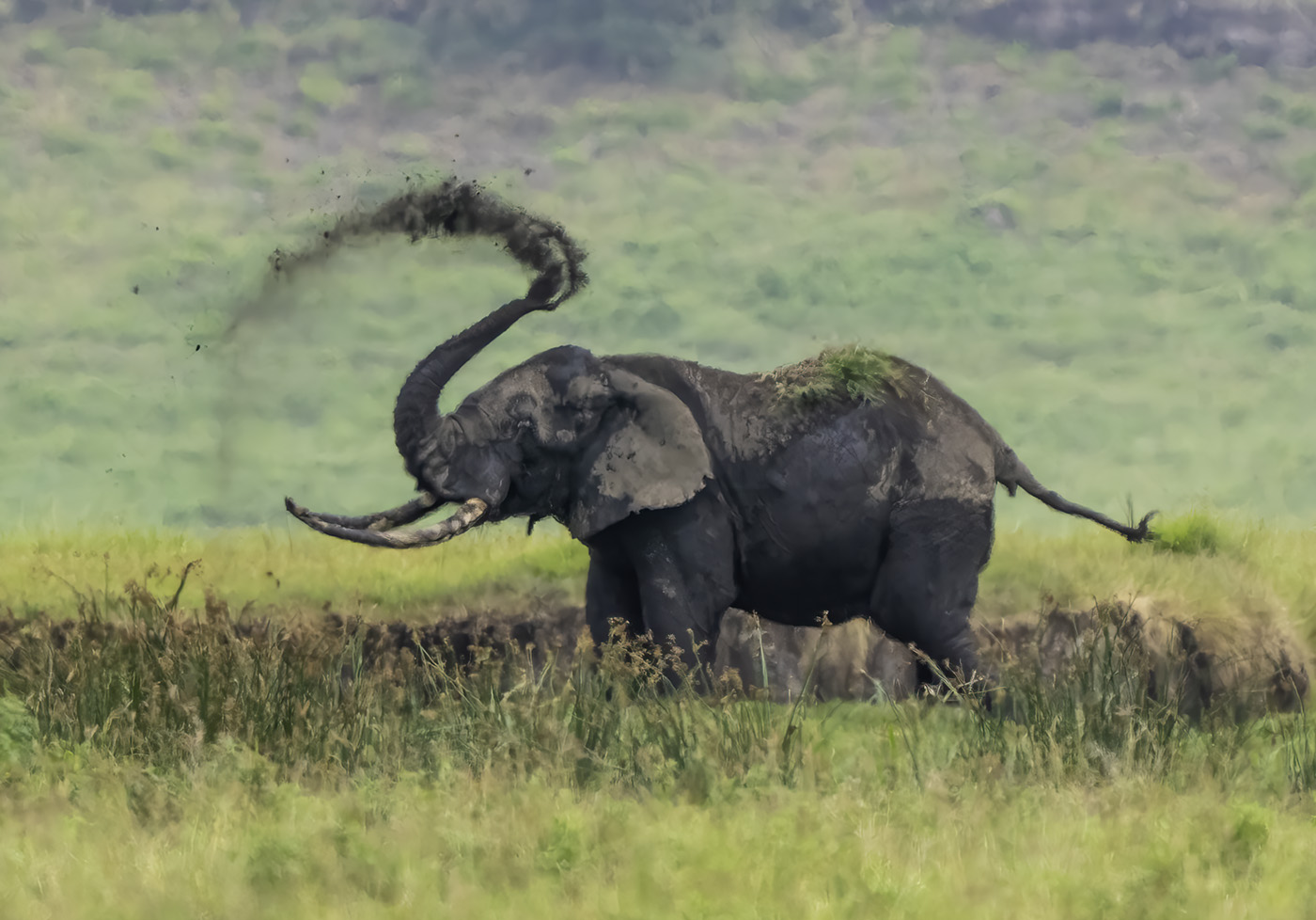 Elephants will spray their backs with dirt, mud and grass to protect themselves from the sun, the flies and to cool down their body. What a surprise to see this in action. What a bigger surprise to see that I got the shot