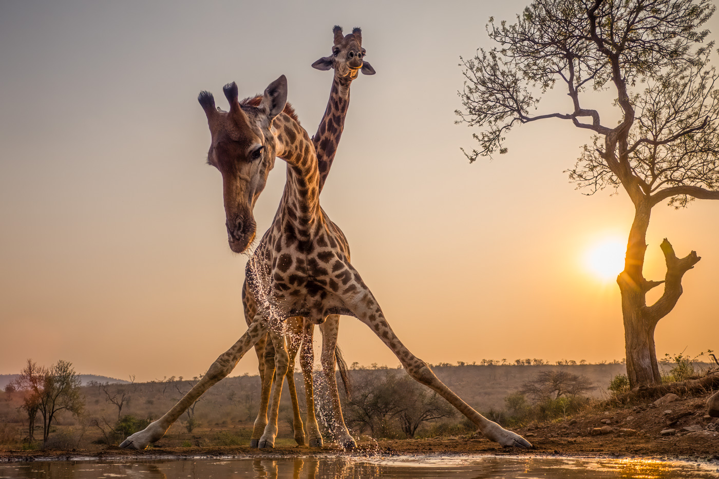 A giraffe raises its head after drinking, while its friend keeps a lookout for danger.