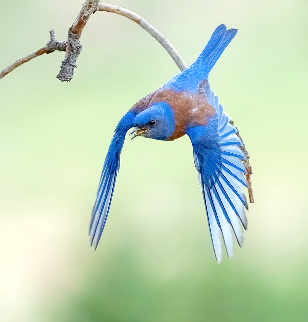 Western Bluebird bringing a tiny snack to his nest