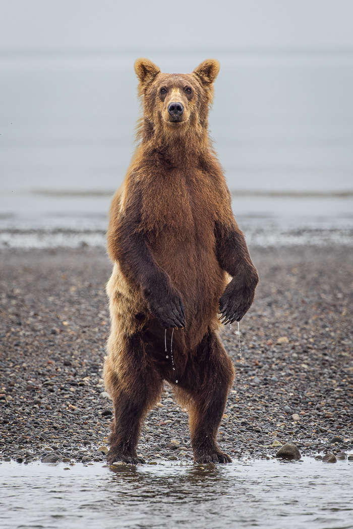 A brown bear sow stands up on her hind legs to get a better view of her surroundings.