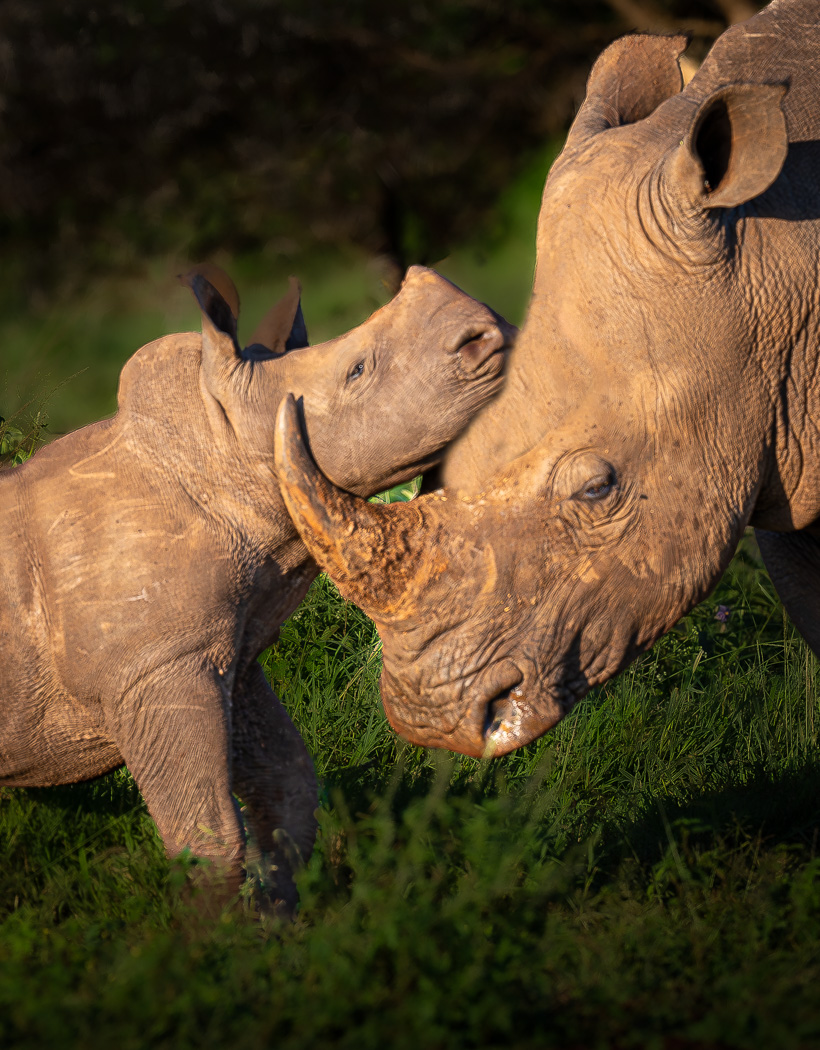A rhino calf cuddles up to its mom in a tender moment of affection.