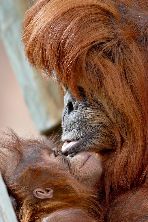Mother orangutan kisses her 15-month-old baby