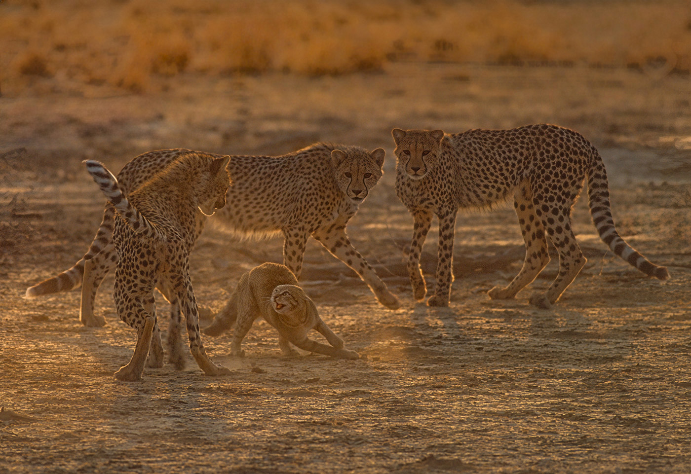 Cheetah surround a snarling African Wildcat 05304a