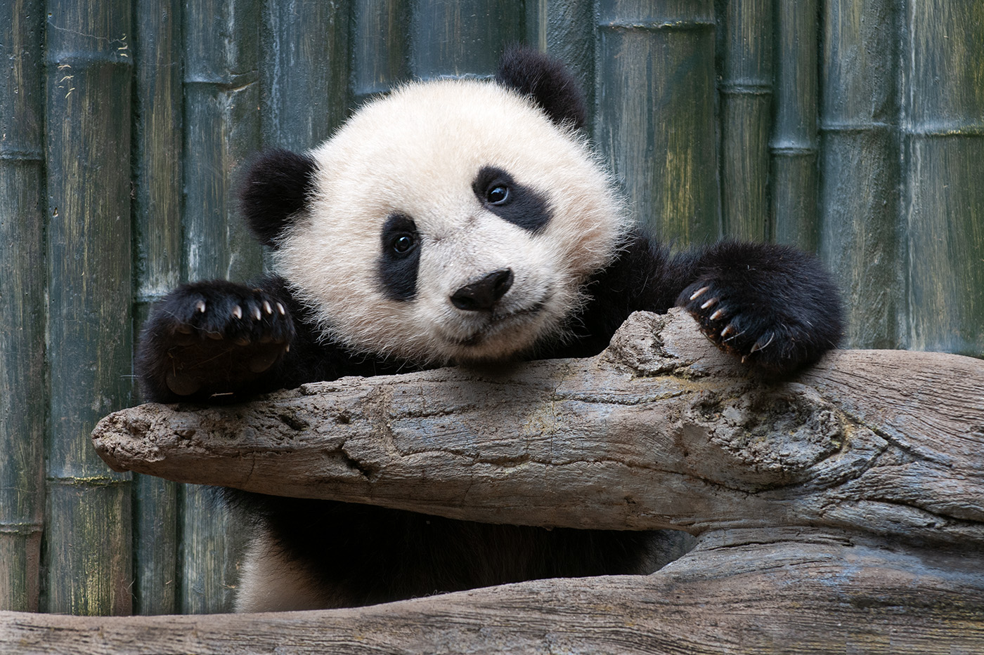 The giant panda cub could not have been more adorable as it hung over a log in its enclosure.