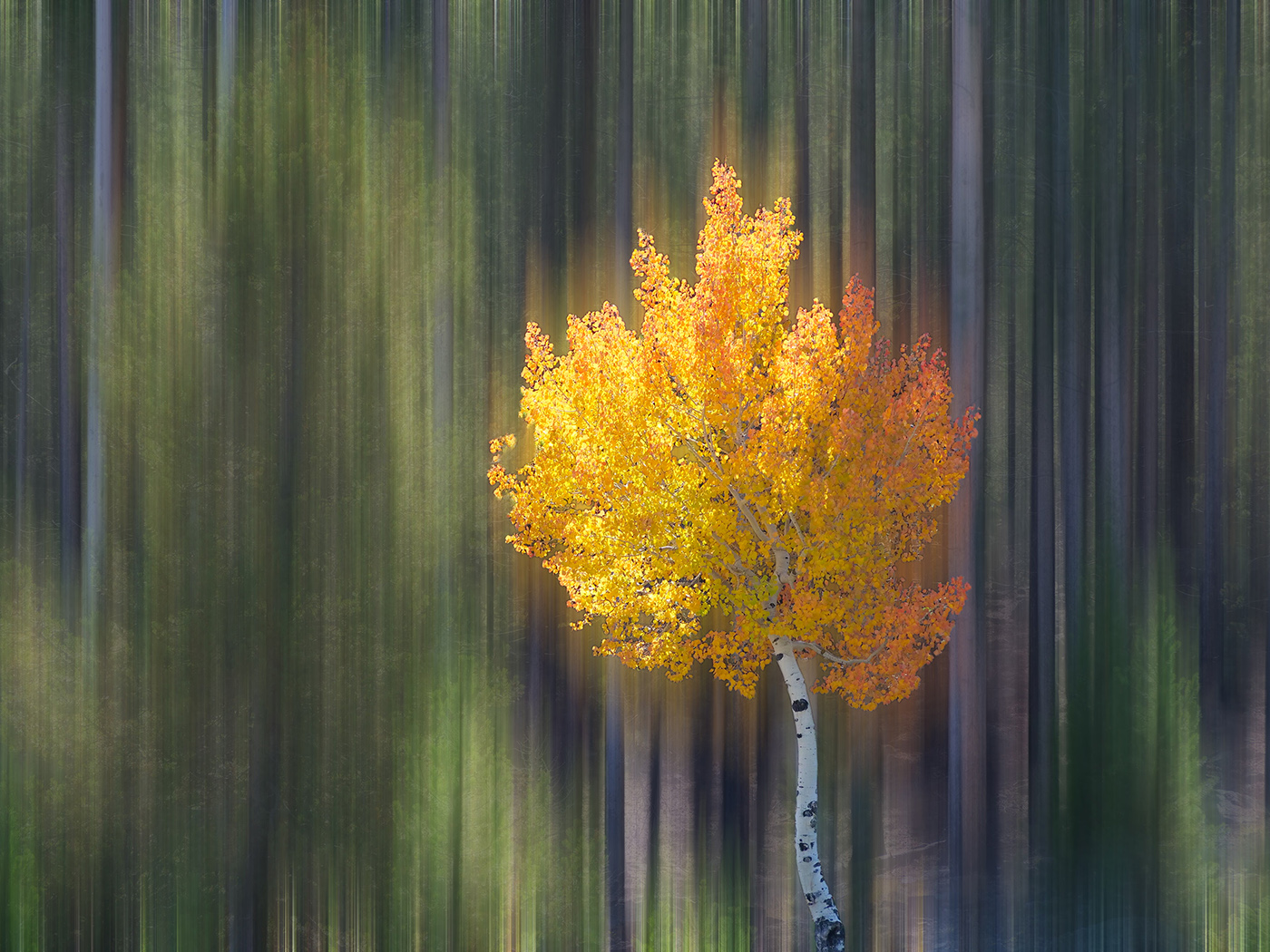 Aspen tree in yellow and evergreen tree backdrop. Vertically blurred evergreens with faint overlay.