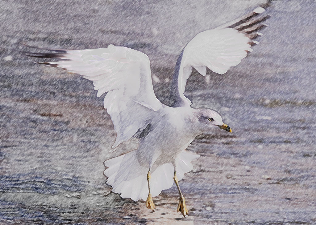 Removing the Canada goose directly behind the gull and using the colored pencil effect turned this into a usable photo.