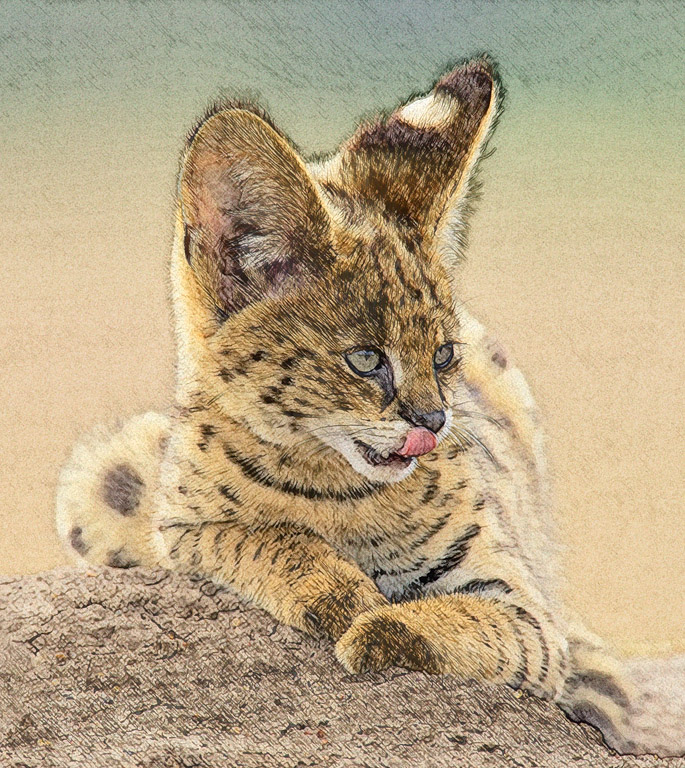 A young serval (Felis serval) atop a termite mound. Taken in the Masai Mara region of Kenya, Africa. I cloned out some extraneous foliage, rocks, and a spider web, then applied a sketch and watercolor effect.
