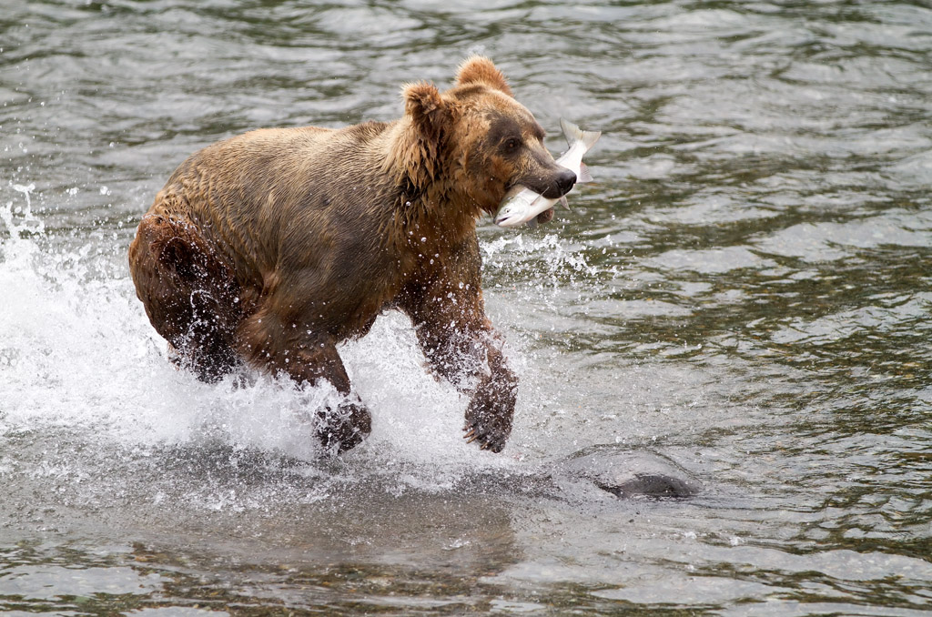 A male grizzly bear has successfully caught a salmon and is racing from the scene to avoid sharing his feast.