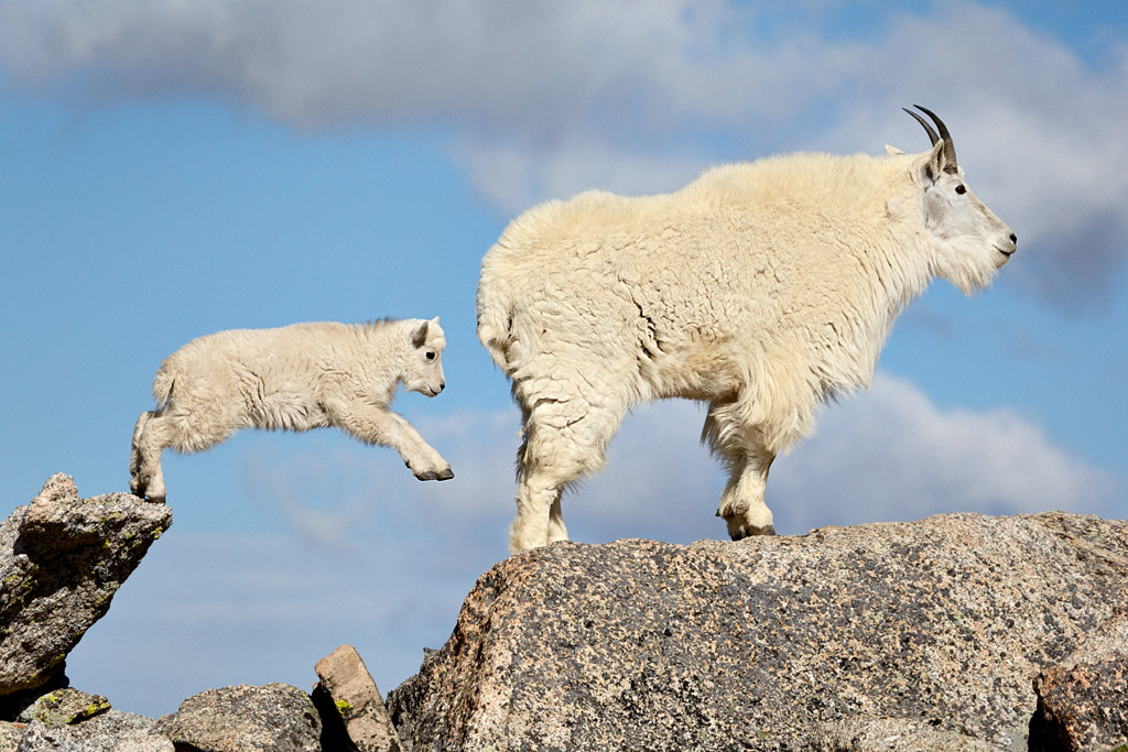 A newborn mountain goat (Oreamnos americanus) leaps to reach its mother. The young are very precocious and easily navigate the rugged tundra landscape only a short time after being born.