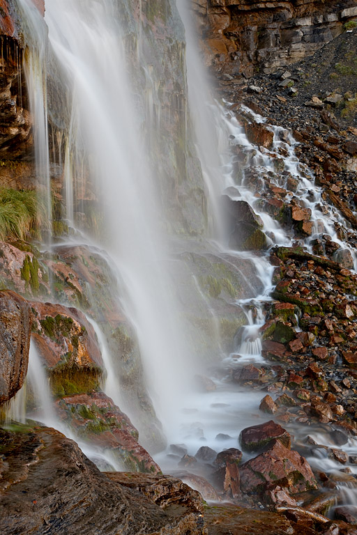 I used a polarizer to reduce the reflections on the wet rocks and a 3-stop neutral density filter to increase the motion blur of the water.