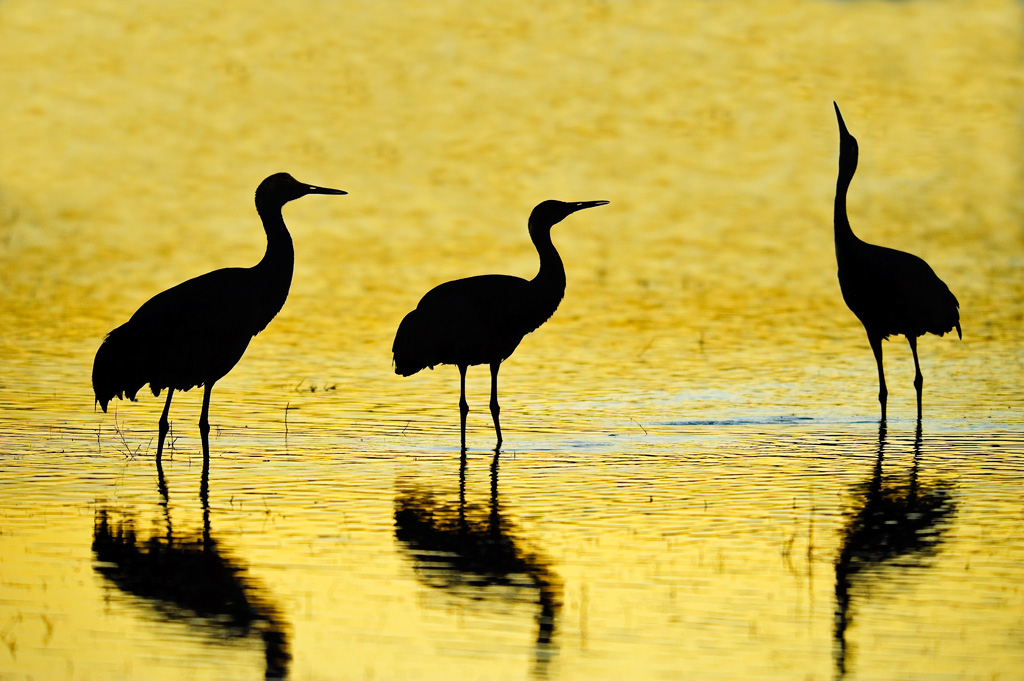 In Bosque with Russ Burden, I photographed these tree sandhill cranes in the reflected golden light of sunset.