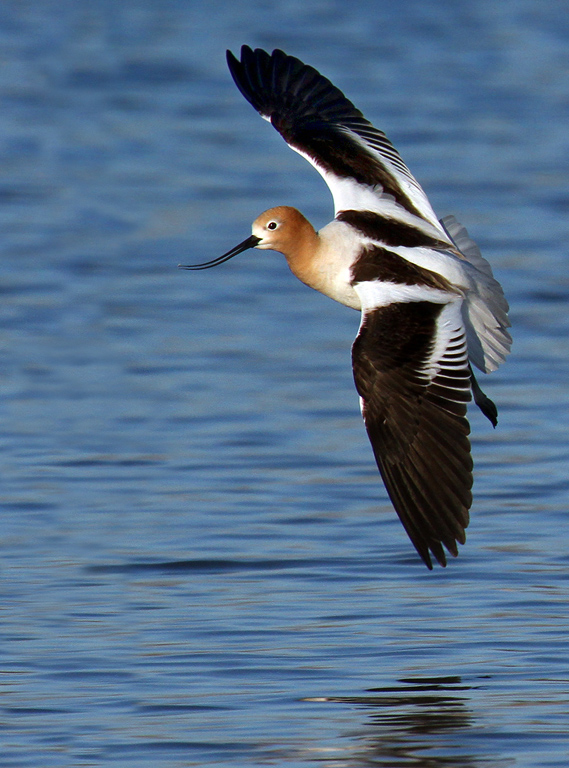 Evening light Avocet coming in for a landing on the water; cropped