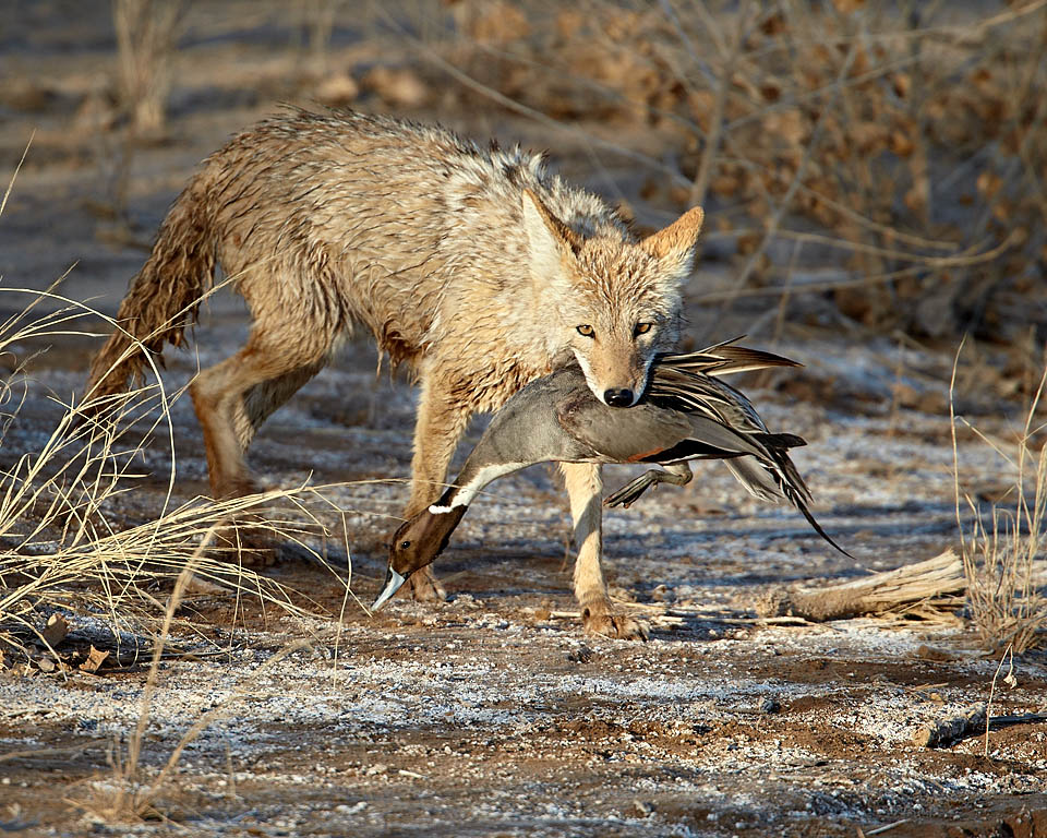 Coyote (Canis latrans) with a Northern pintail duck (Anas acuta)