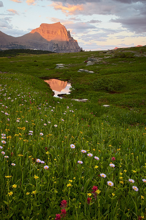A high-altitude meadow of alpine wildflowers leads to a seasonal tarn reflecting Piegan Mountain.