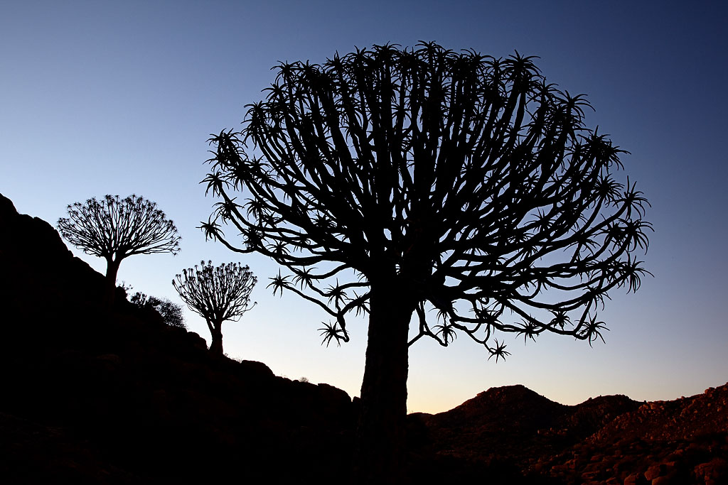 Several quiver trees or kokerbooms (Aloe dichotoma) after sunset.
