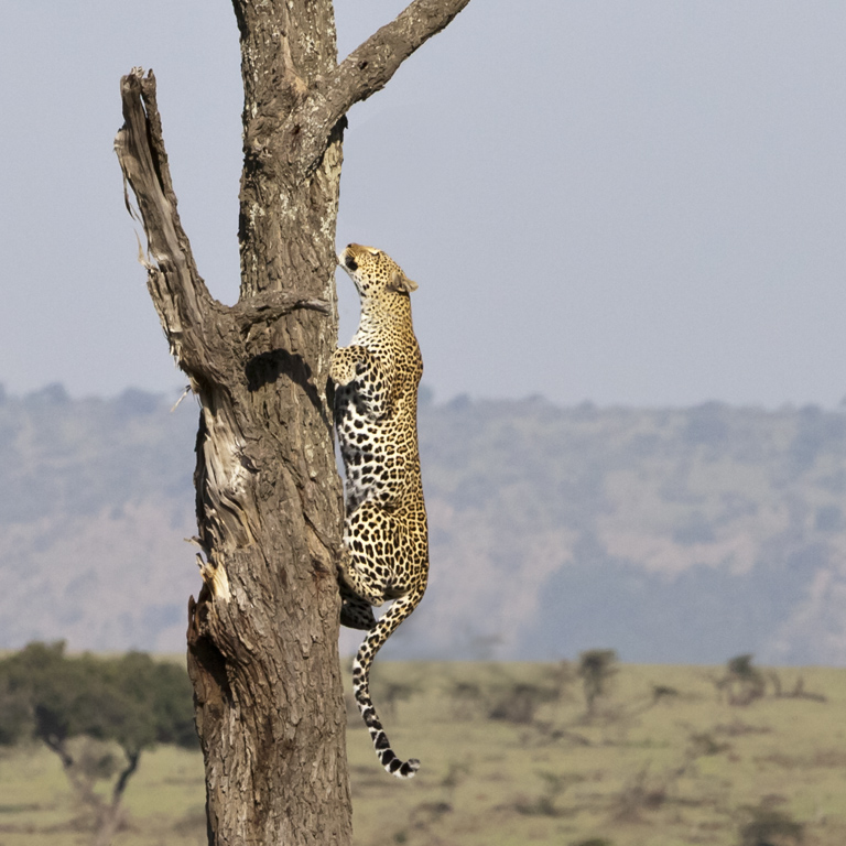 A leopard climbs up a tree to escape the deadly chase from a group of hyenas in the Masai Mara Game Reserve, Kenya, Africa