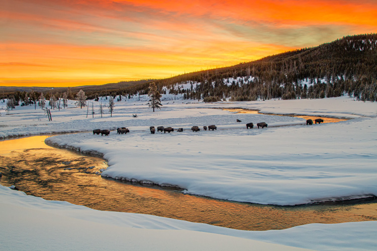 Buffalo on the Madison River at Sunrise