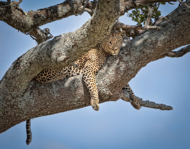 A leopard takes advantage of the shade and rests in the branches of the Kigelia or Sausage Tree in Tarangire National Park