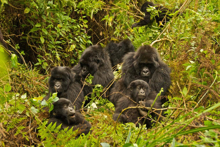 Seven members of a mountain gorilla family are grooming and relaxing together.