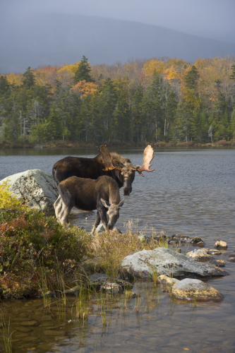 We had to get up at 4am, drive to the gate at Baxter State Park from Millinocket, Maine and get in line for the 5am opening. It took about 30 minutes to get processed through the gate, then an 8 mile drive on a dirt road to a campground near the pond, followed by a 20 minute hike with all of my gear to a viewpoint on Sandy Stream pond. Fortunately, we had good weather, beautiful fall foliage, and lots of moose and of course, lots of photographers. It was a good day. A bull moose and calf pair look to enjoy breakfast together in the fall foliage of Sandy Stream Pond.