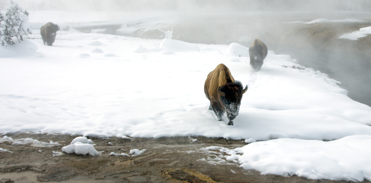 Bison forage in Yellowstone National Park near the warm waters of the rivers that flow through the park.