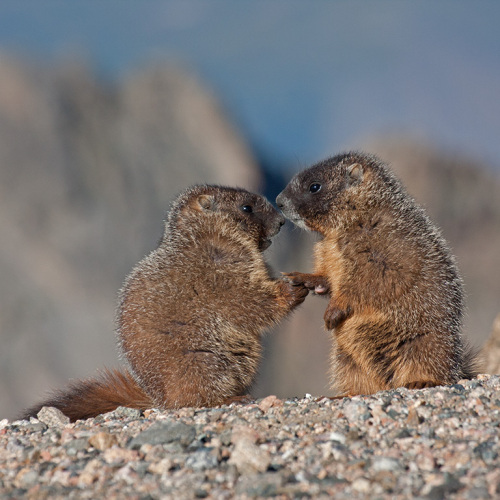 These young yellow-bellied marmots were photographed at 13,500 feet or so on the side of Mt. Evans. They may have been siblings. Sometimes they seemed affectionate; other times they seemed quarrelsome and pugnacious. Here they seem to be discussing something especially important.