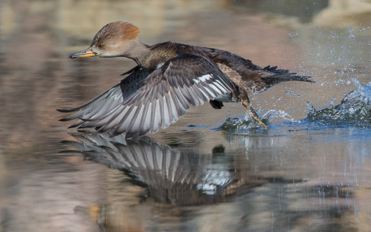 Female Hooded Merganser taking off at South Platte River.