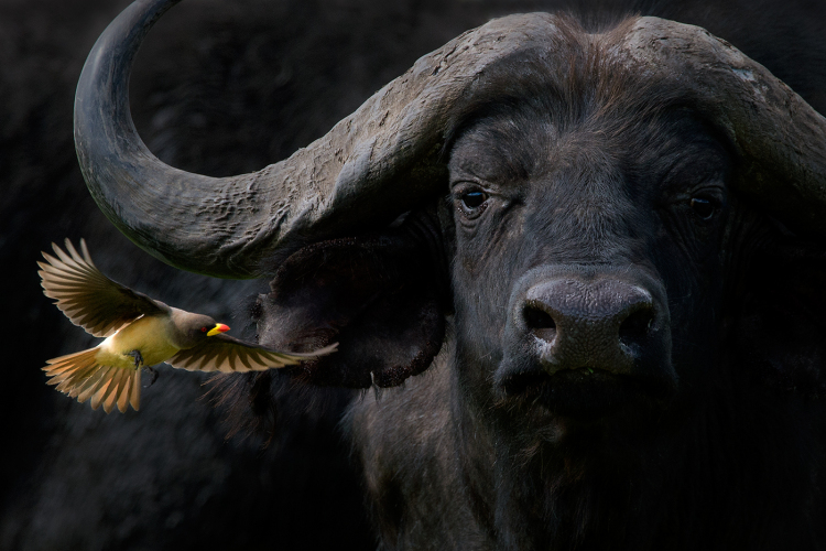 I was photographing a breeding herd of Cape buffalo when I quickly became fascinated with the active Yellow-billed Oxpecker flying on and around all the Buffalo. The challenge began to capture one in focus as it came in for a landing. The Yellow-billed Oxpecker is native to Africa and will perch on Cape buffalo as well as other mammals to eat the ticks and other parasites found on the animal.
